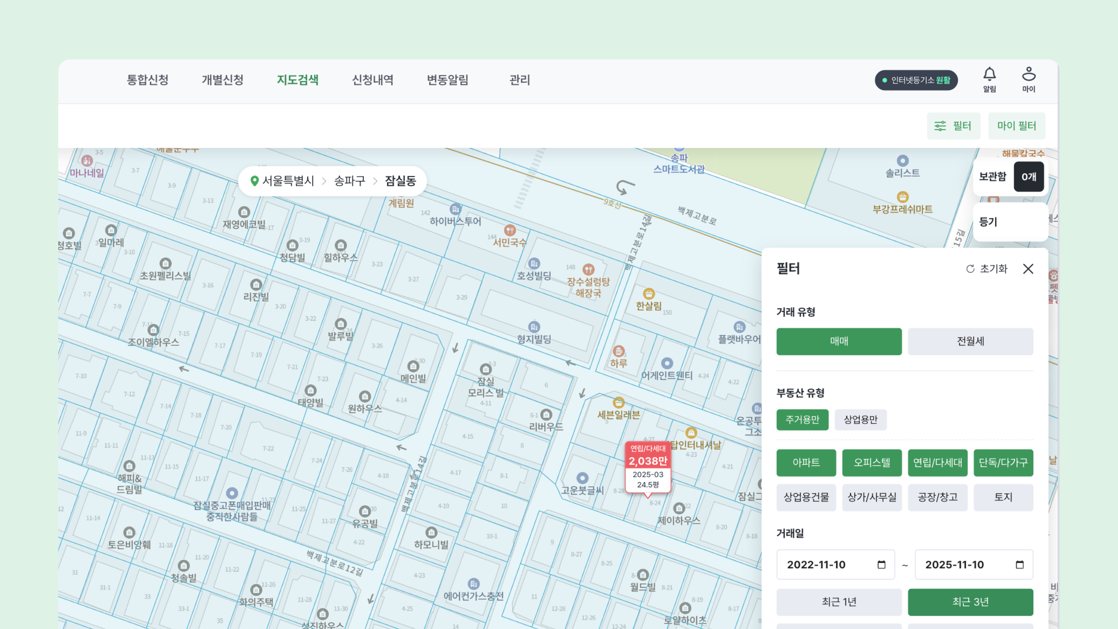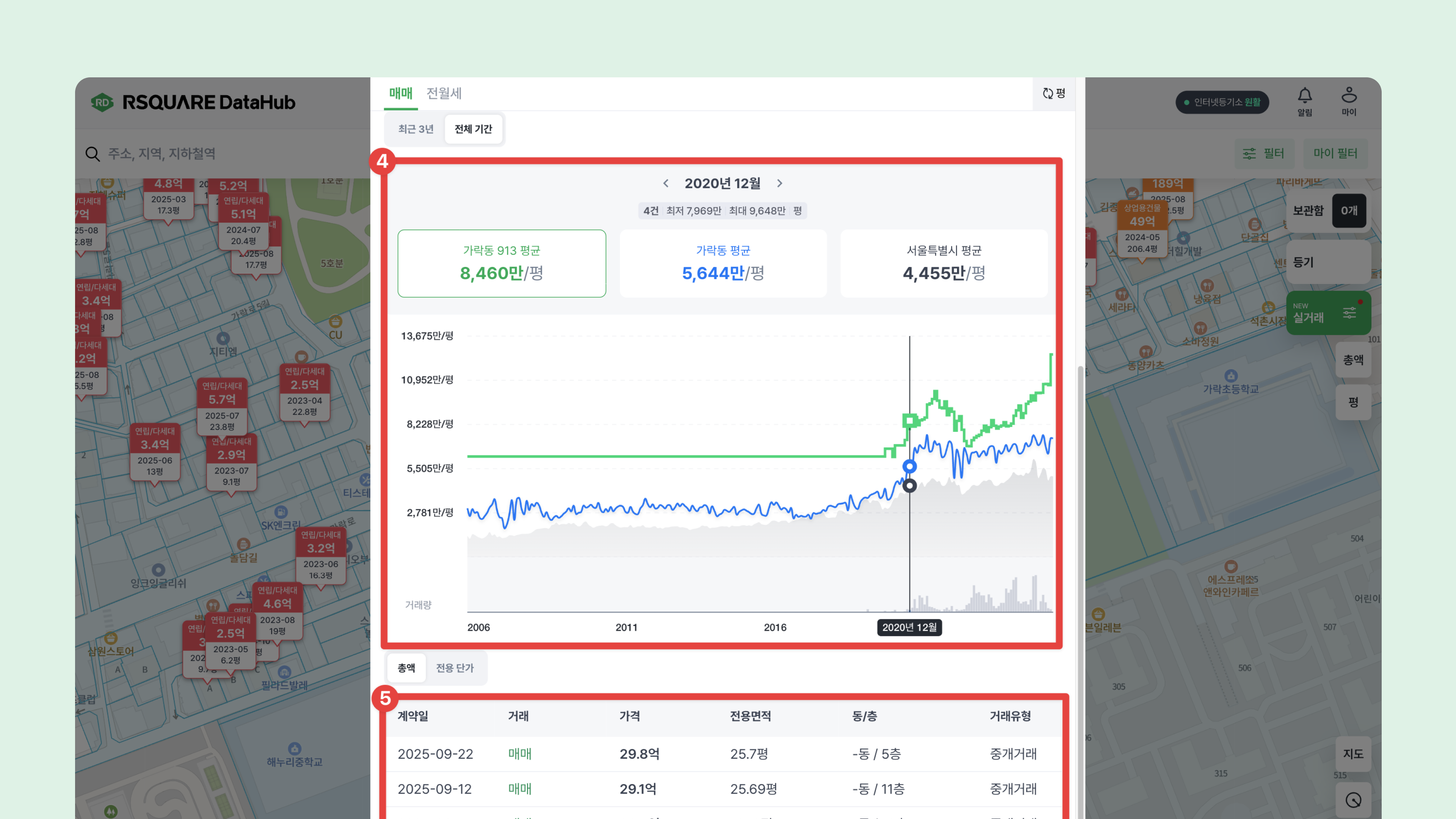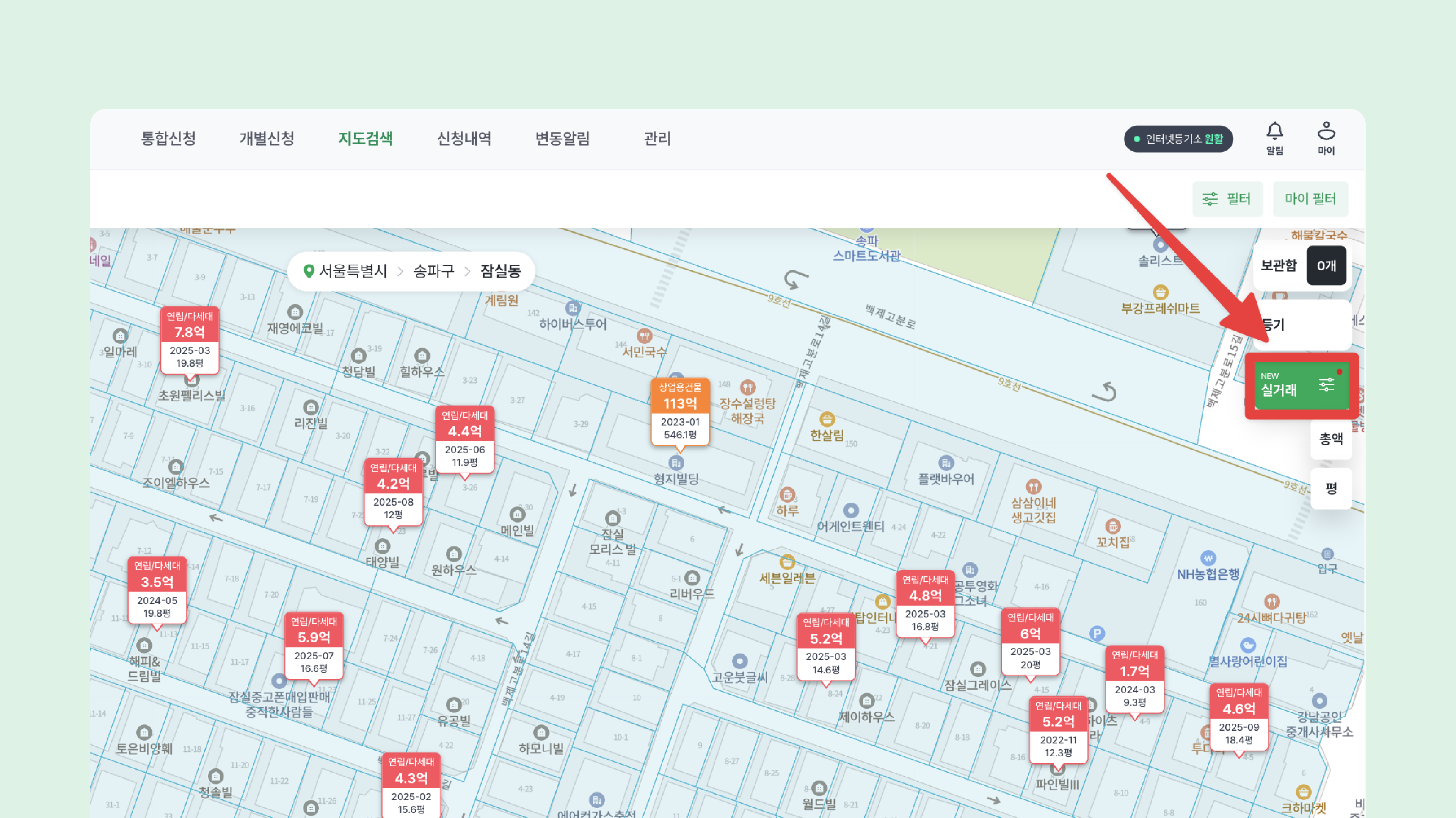 실거래가 필터 기능을 통해, 원하는 조건의 실거래가 마커만 지도에서 표시할 수 있습니다.