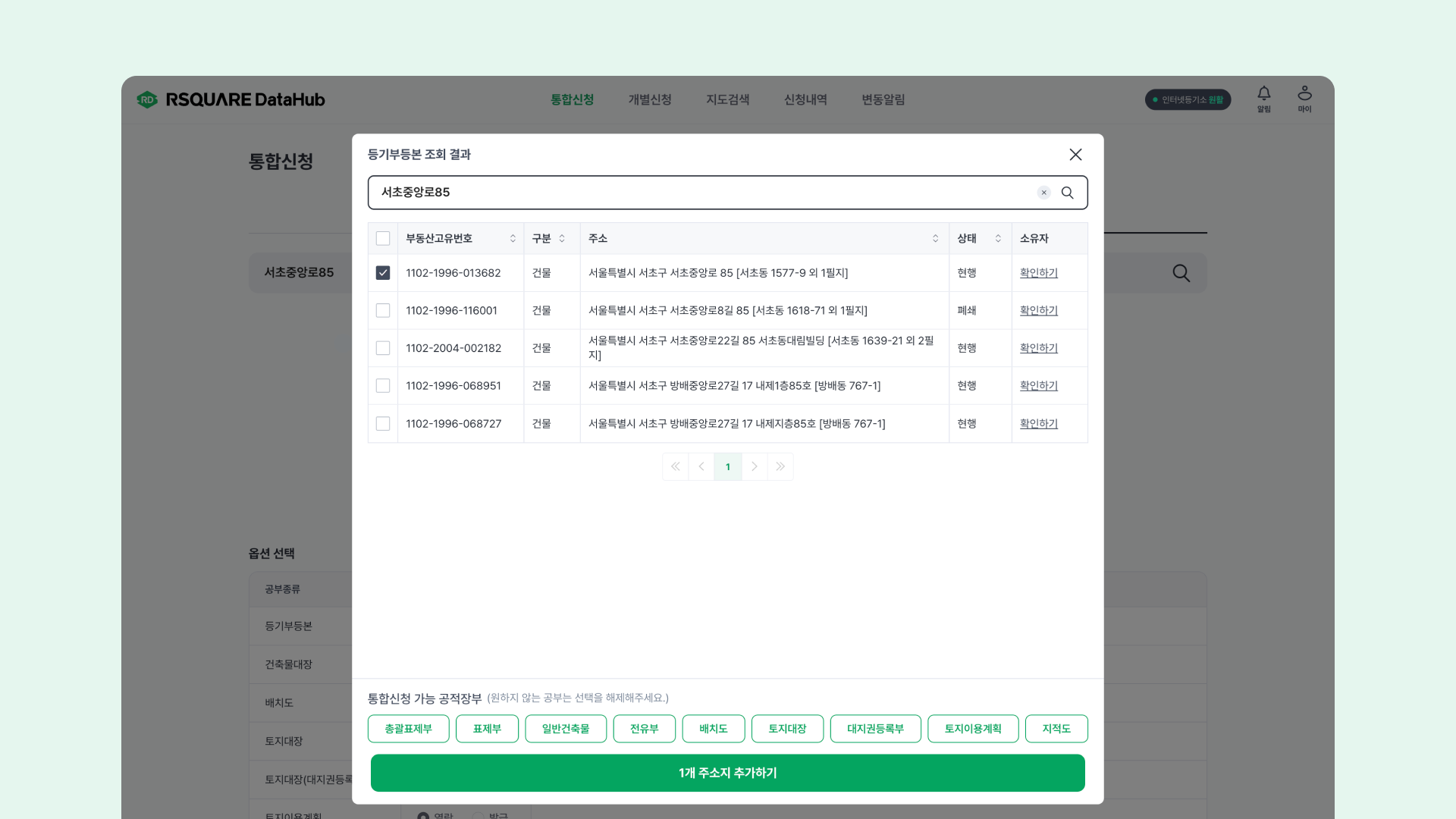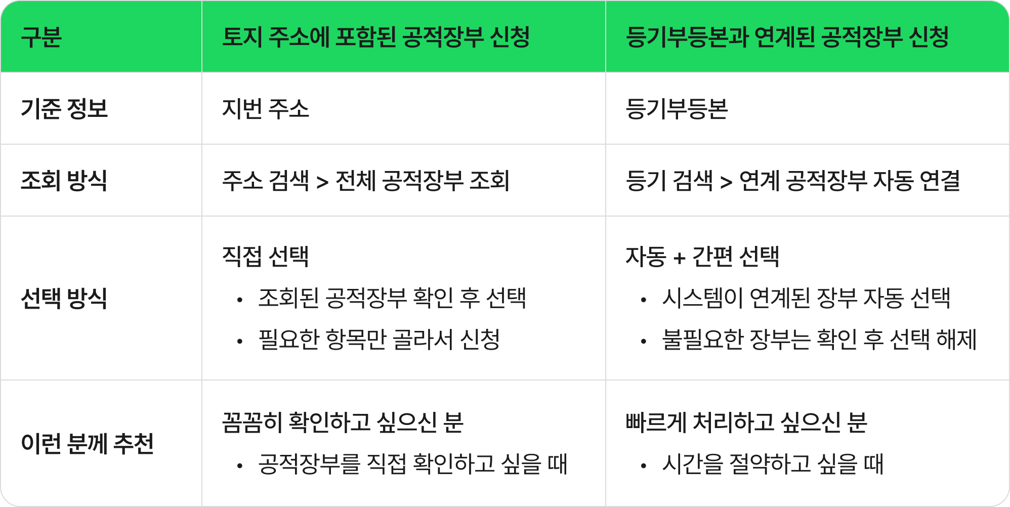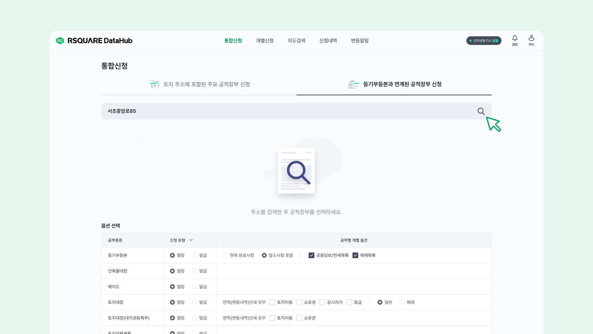 특정 주소지의 부동산에서 다양한 공적장부가 필요한 경우, 부동산 등기부등본을 기준으로 연계된 공적장부를 한 번에 조회하고 신청할 수 있습니다.