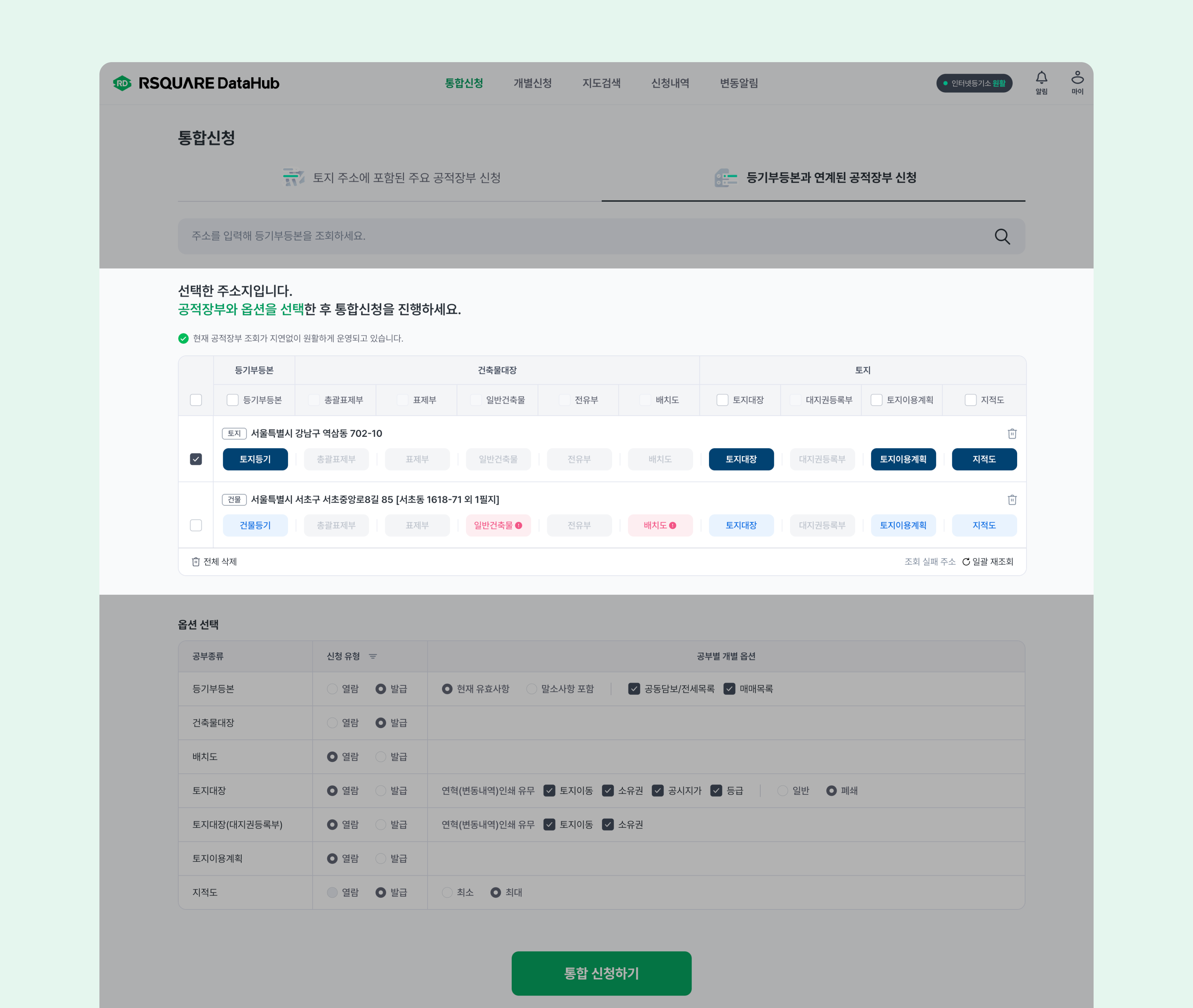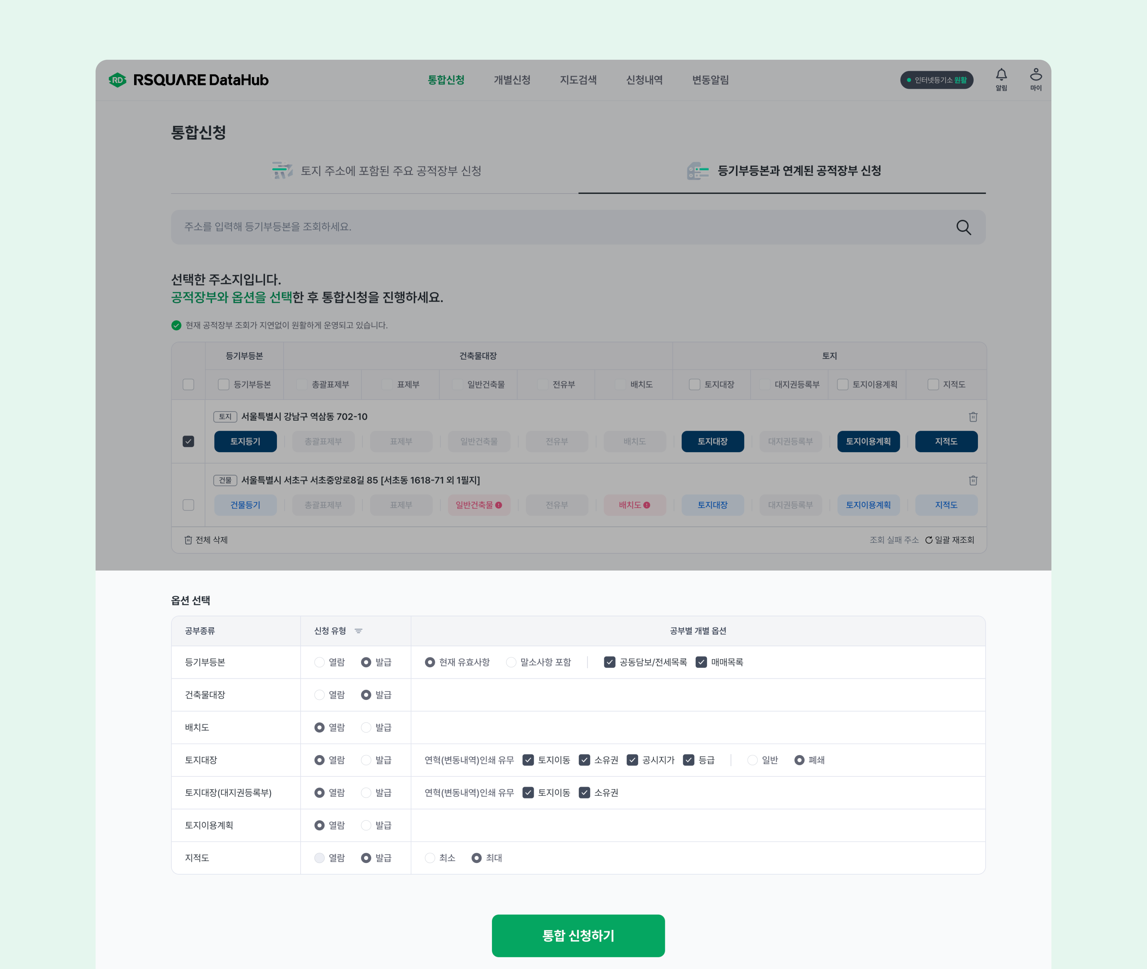 옵션 선택에서 열람/발급할 공적장부의 옵션을 선택한 후 통합 신청하기 버튼을 클릭합니다.
