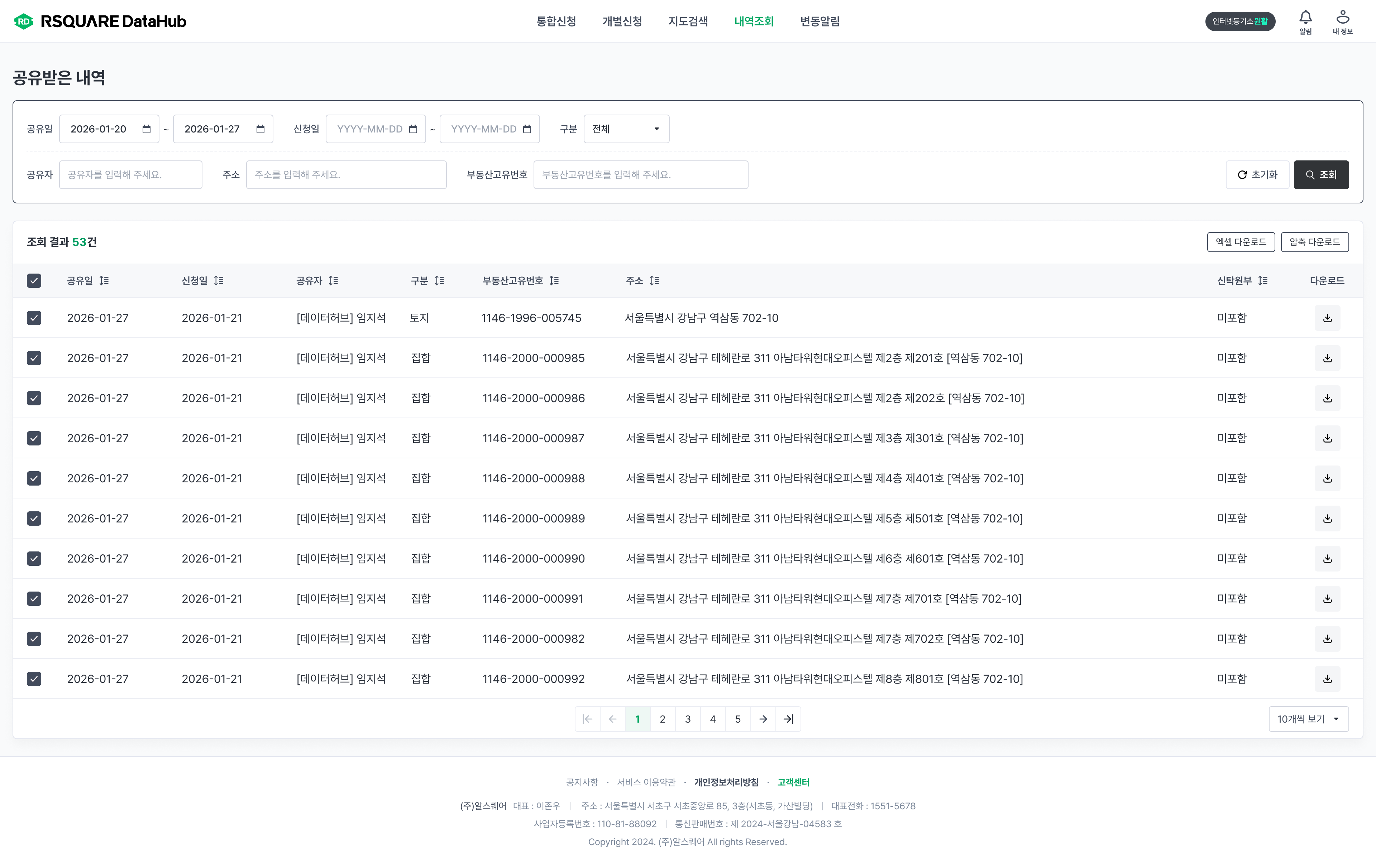 내역조회 > 공유받은 내역 메뉴에서 동료가 공유한 부동산등기를 조회하고, 원하는 방식으로 다운로드 합니다.