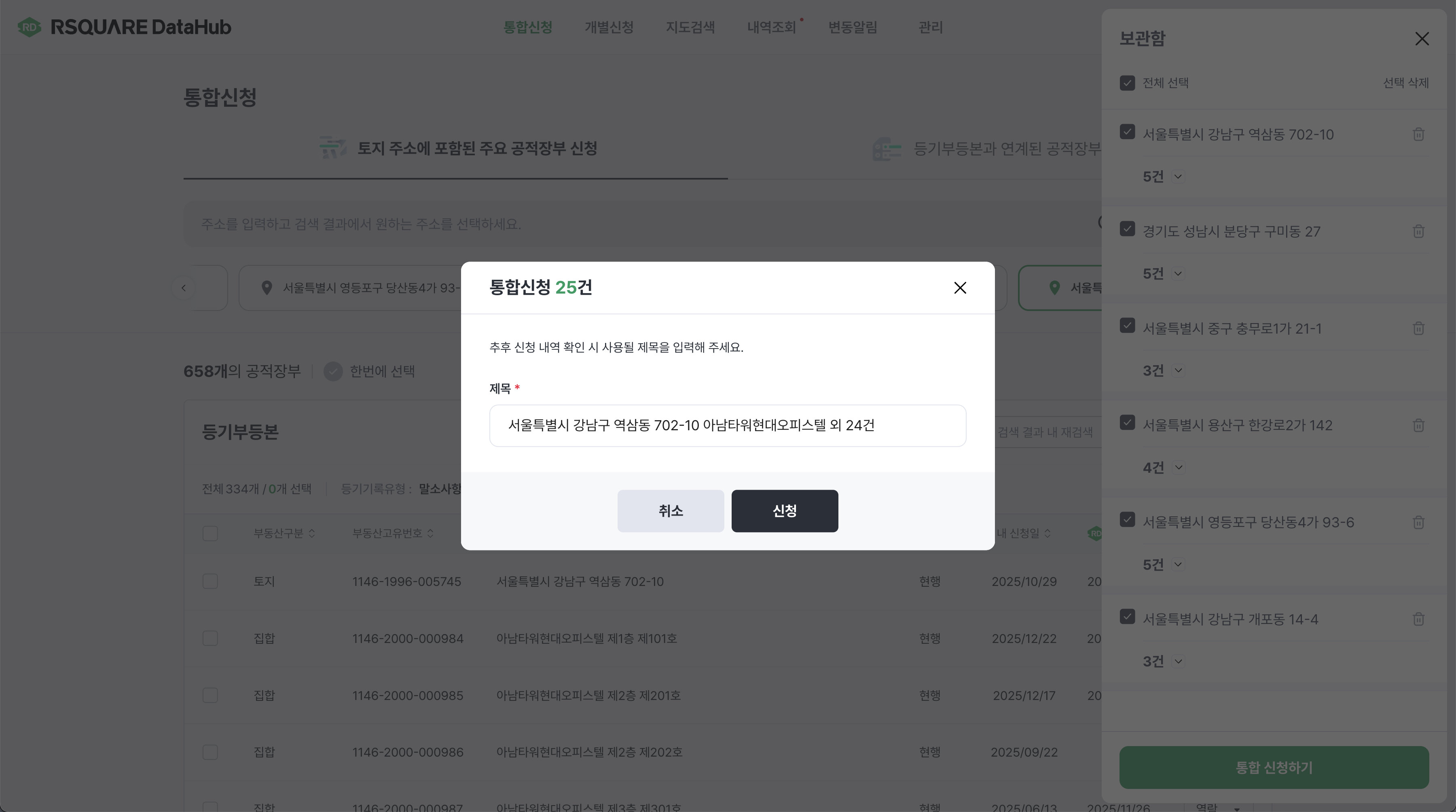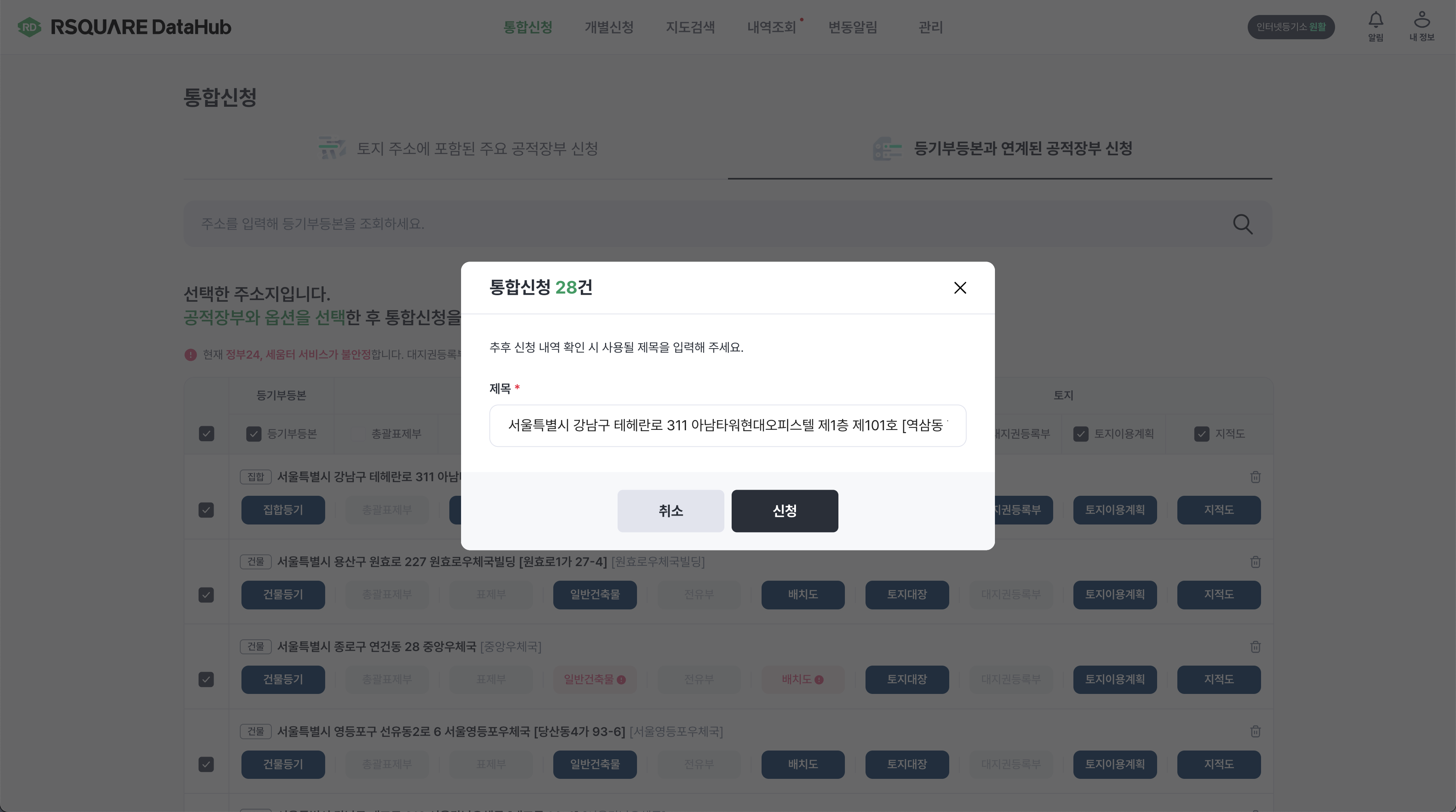통합신청메뉴에서 주소 또는 등기부등본로 공적장부를 검색하고, 열람/발급할 공적장부를 선택하여 신청을 진행합니다.생성된 제목 입력 팝업에서 신청 제목을 입력하고