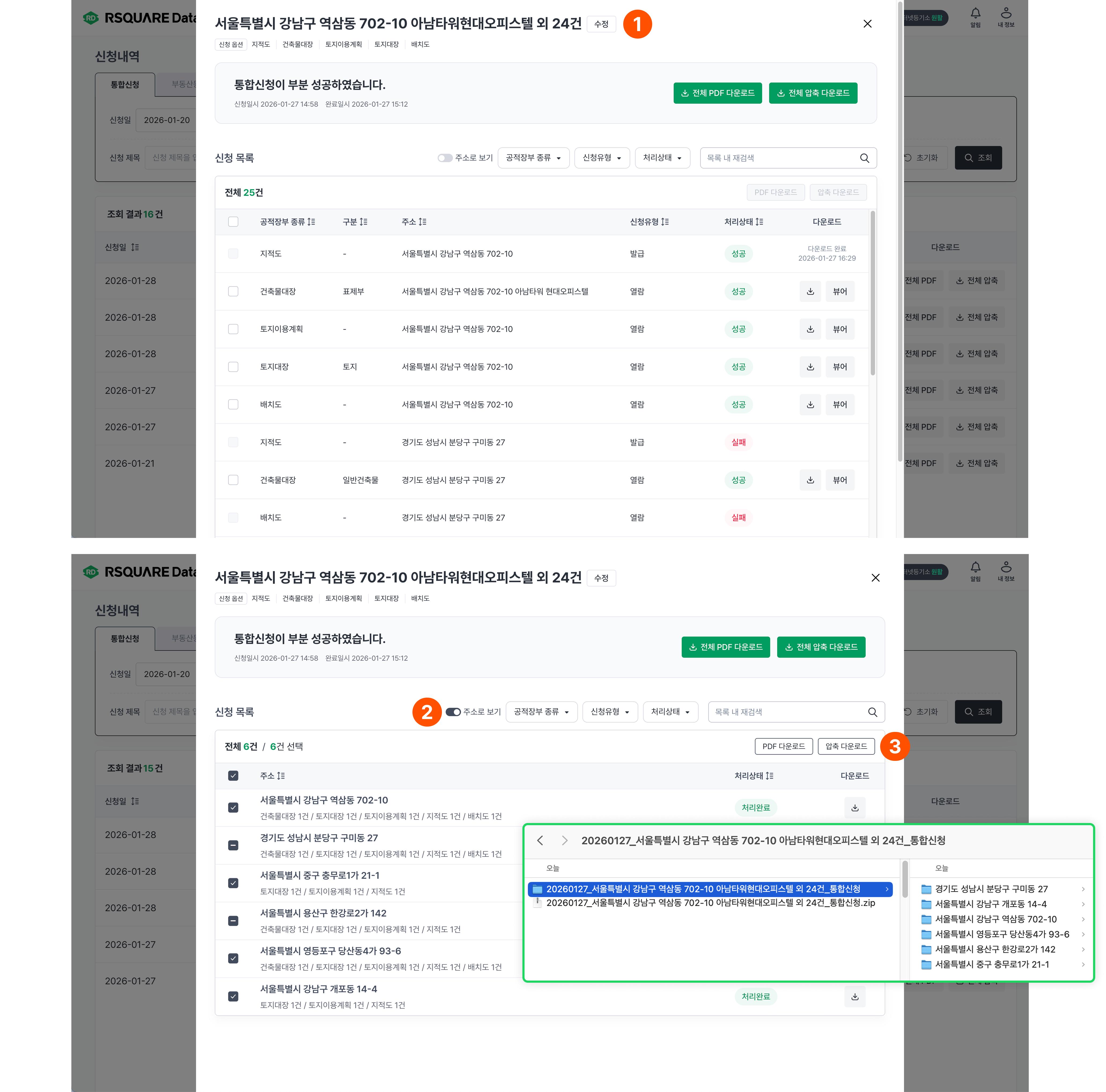 주소로 보기토글을 활성화한 상태에서압축 다운로드버튼을 클릭하면, 주소 단위로 폴더가 구분된 PDF 파일을 압축 다운로드할 수 있습니다.