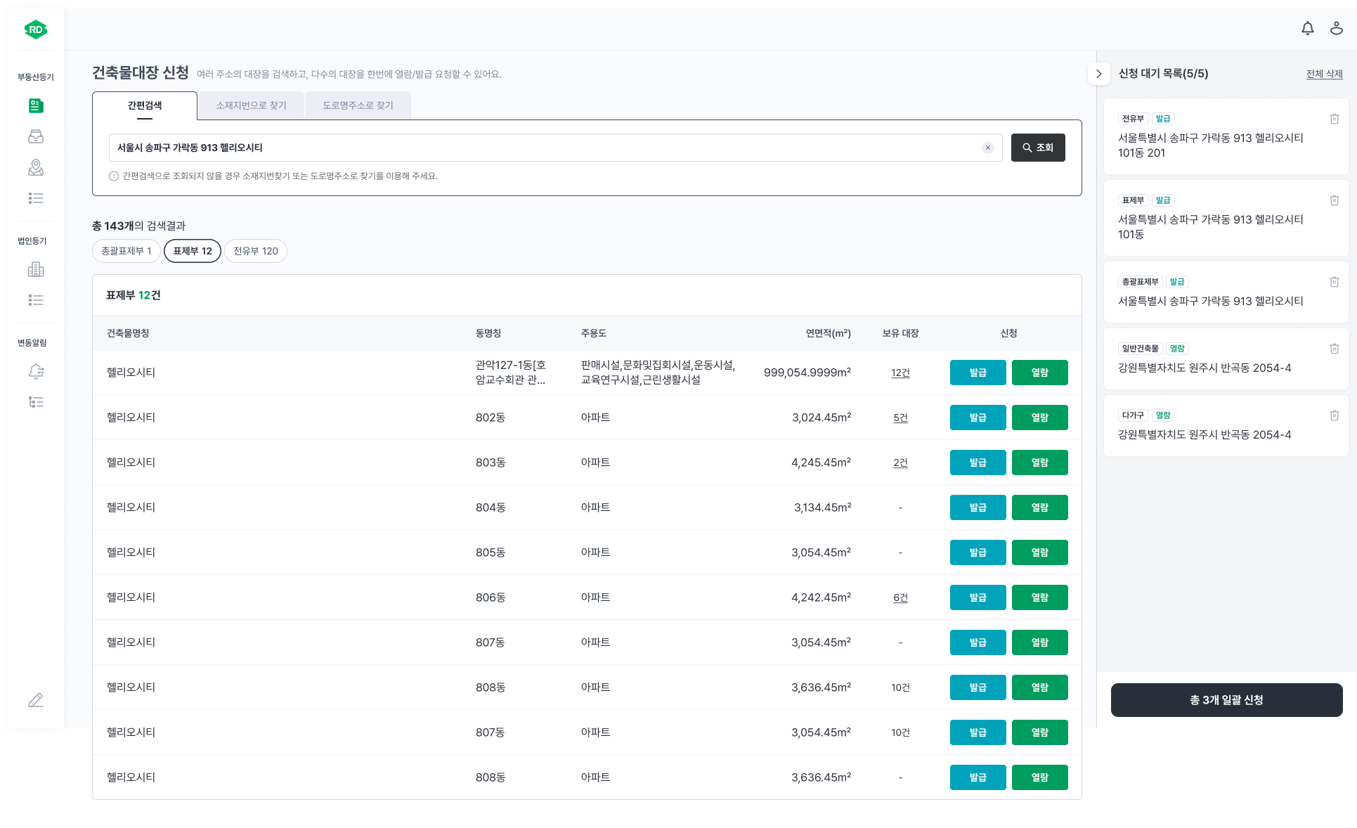 총괄표제부, 표제부, 일반건축물, 다가구, 전유부 등 열람/발급하고자 하는 대장을 선택할 수 있습니다.