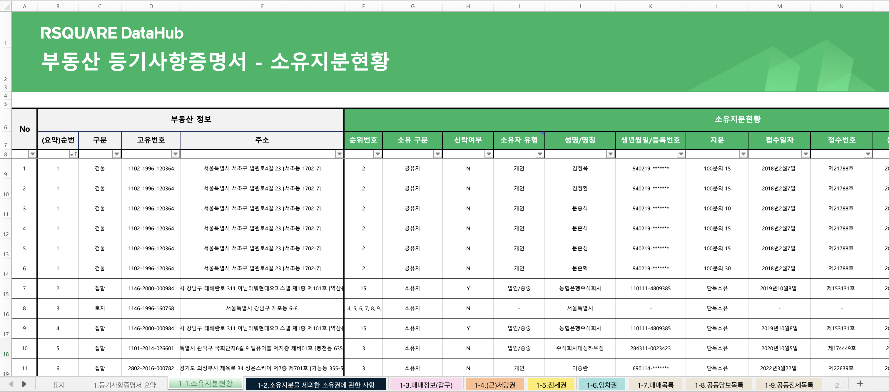 다운로드 받은 엑셀 파일을 실행하면 선택하신 항목별 부동산등기 데이터를 확인하실 수 있습니다.
