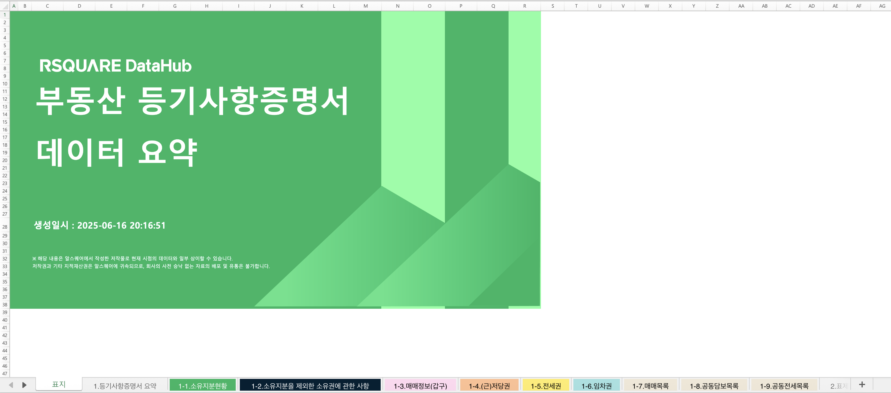 발급또는열람 실패한 부동산등기는 엑셀 파일에서 데이터가 표시되지 않습니다.