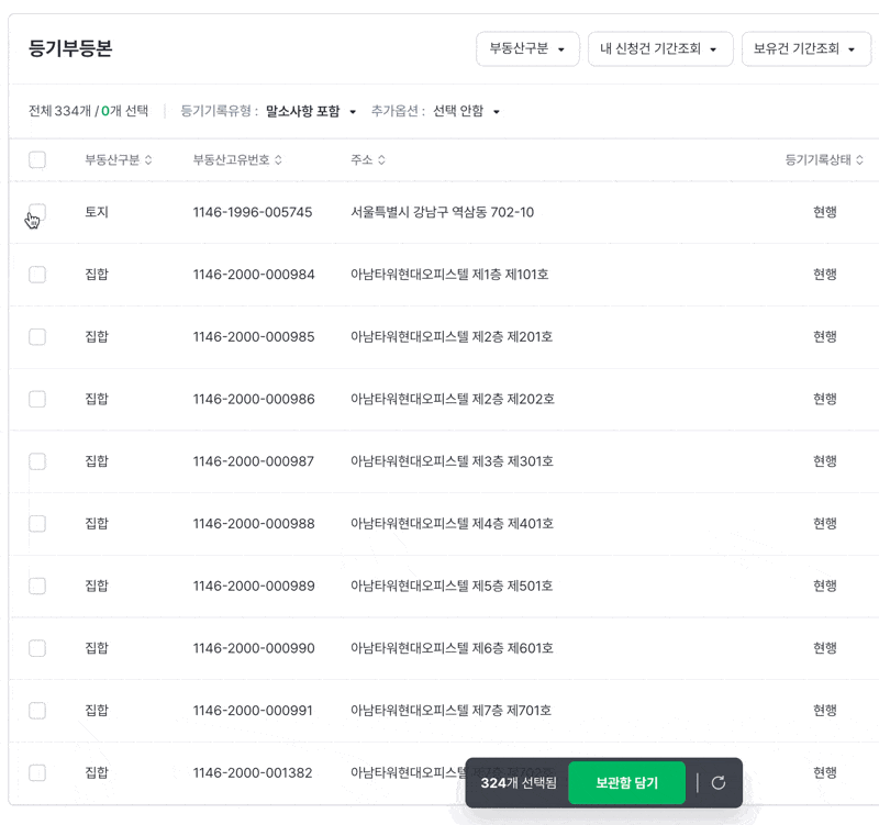 등기 조회 결과 팝업, 보관함